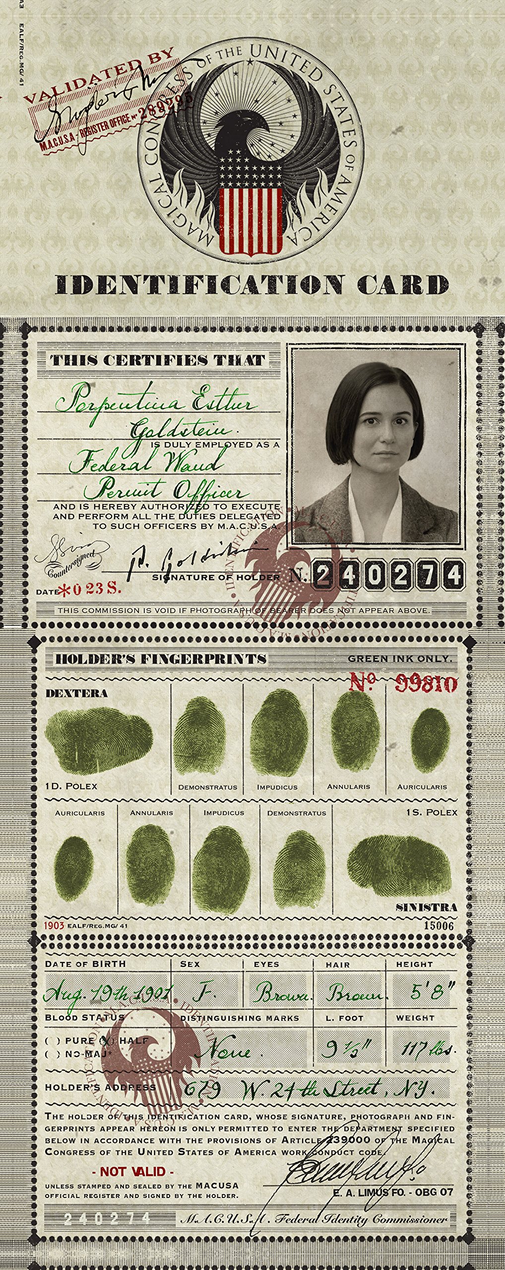 I'm not sure what the other items under her name are - they could be authorising names, or descriptions of her job, but I think the first might say [Felisal???] Wand. The printed text underneath the handwritten seems to start with 'AND IS', so the ID card certifies that Porpentina Esther Goldstein IS [something] [handwritten x2] AND IS [something long]. Hmm.